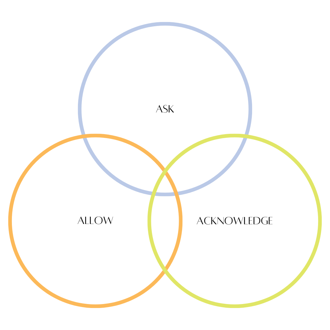 The 3 interlaced circles represent 3 of the key concepts of self-awareness: ASK, the willingness to be curious and observe; ALLOW, the intention to feel rather than just analyze; ACKNOWLEDGE, the act of bringing that to cognitive awareness by naming the experience.