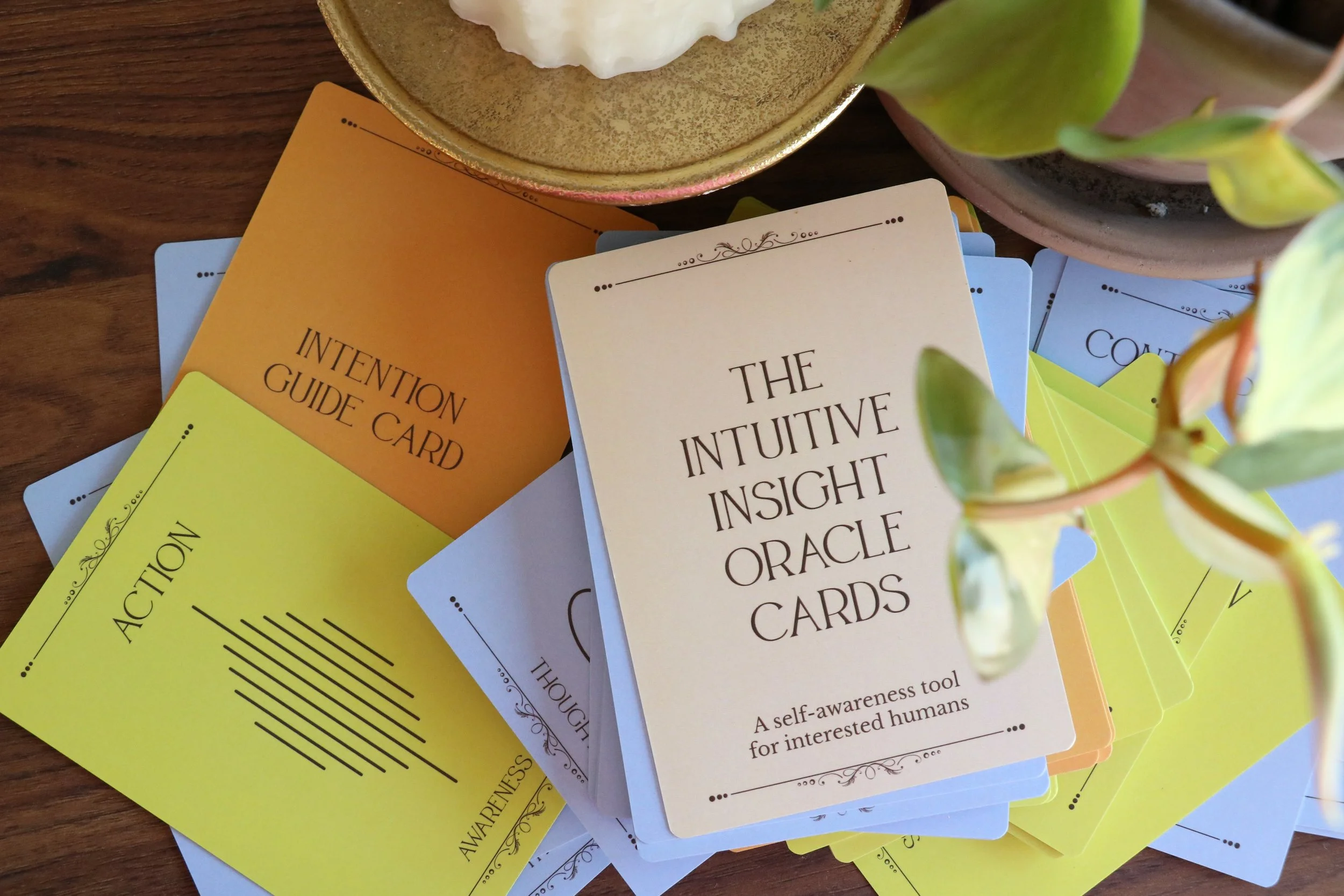 The Intuitive Insight Oracle Cards offer a fine opportunity to create that gap by deliberately setting up your personalized framework for self-awareness. When using them to formulate a 3-card spread to engage them as a unit for experimentation with the purpose of intentional self-awareness, learning to ask questions as part of the process becomes a key resource for deepening your self-understanding and taking it to the next level. Experiencing the integration of the 3 cards and noticing how it’s affecting your experience of the world as you do it, is amazing and totally worthwhile. Doing a ‘debrief’ at the end of the day (or prescribed time frame as determined by you) is where much of the underlying wisdom comes to light and often where the unconscious mind kicks up its previously hidden agendas. Being curious about your thoughts is a simple and effective way to create a gap between the thought, and the YOU who is thinking the thought. I suggest these as a starting point. You can ask all of them or some of them. You can journal or talk out loud. Just let yourself explore in a way that is the most interesting and engaging for YOU.